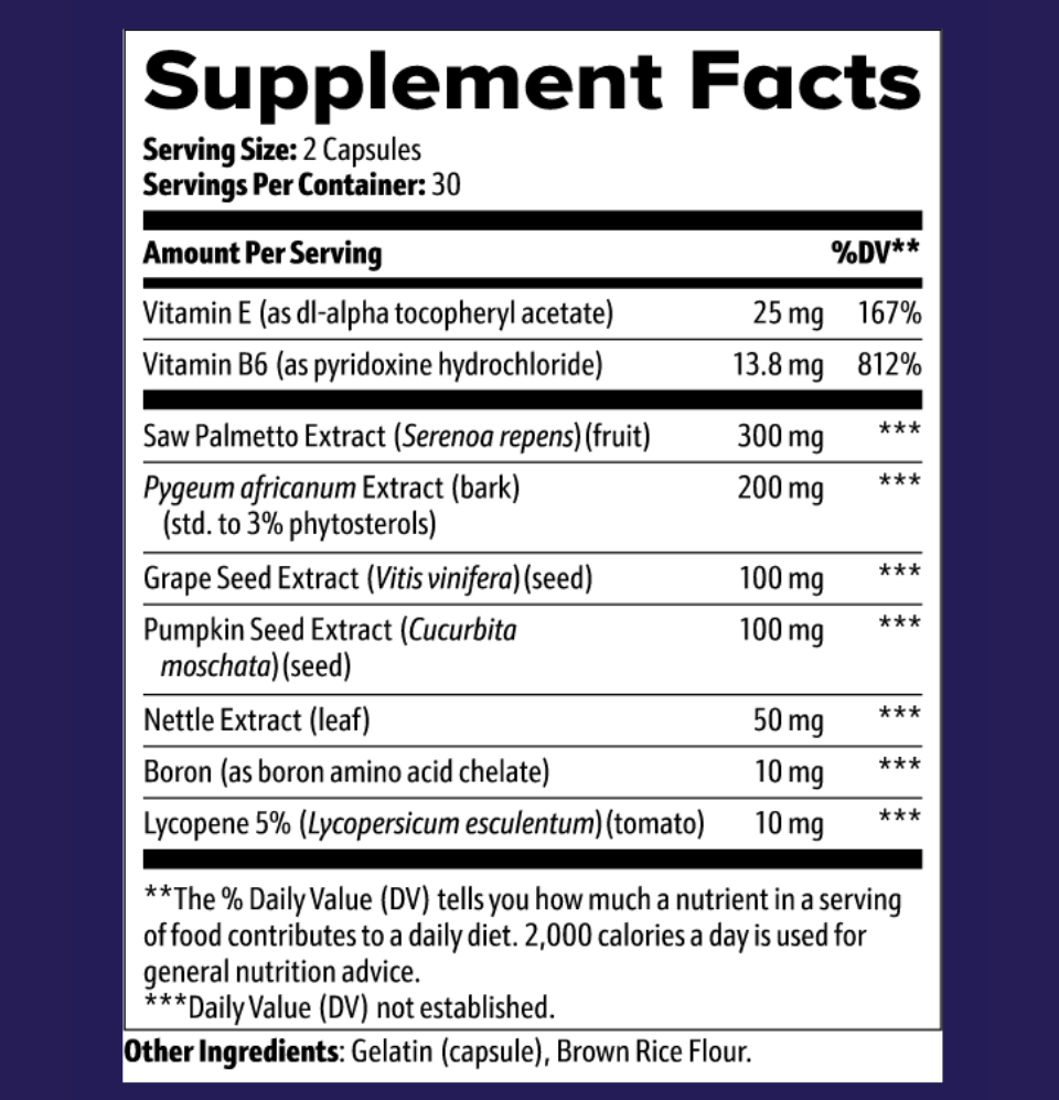 Ingredients: Vitamin E (as dl-alpha tocopheryl acetate); Vitamin B6 (as pyridoxine hydrochloride); Saw Palmetto Extract (Serenoa repens) (fruit); Pygeum africanum Extract (bark) (std. to 3% phytosterols); Grape Seed Extract (Vitis vinifera) (seed); Pumpkin Seed Extract (Cucurbita moschata) (seed); Nettle Extract (leaf); Boron (as boron amino acid chelate); Lycopene 5% (Lycopersicum esculentum) (tomato)
