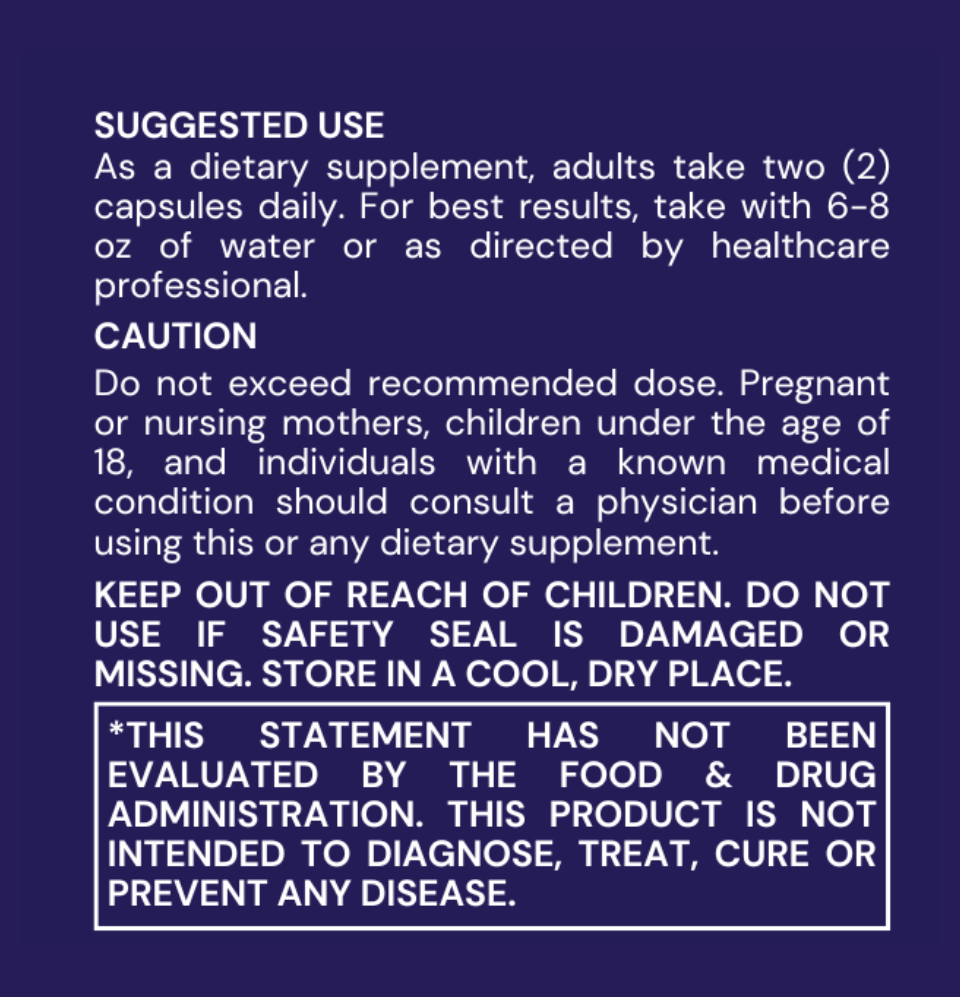 Warning: Do not exceed recommended dose. Pregnant or nursing mothers, children under the age of 18, and individuals with known medical conditions should consult a physician before using this or any dietary supplement. KEEP OUT OF THE REACH OF CHILDREN. DO NOT USE IF SAFETY SEAL IS DAMAGED OR MISSING. STORE IN A COOL, DRY PLACE.